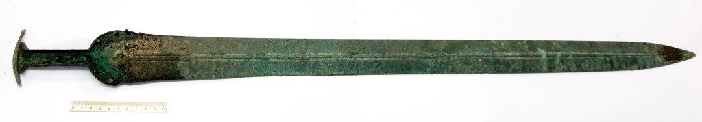 L’épée est datée provisoirement de la fin du XIVe siècle av. notre ère, c’est-à-dire l’âge du bronze moyen. On rappelle que les découvertes d’épées de cette période sont rares et proviennent habituellement, soit de tumuli (ouverts au XIXe siècle et donc sans possibilité d’étudier le contexte archéologique), soit dans le cadre d’un dépôt cultuel (« sacrifice » ou « offrande de l’objet, donc pas trop moyen de contextualiser également).