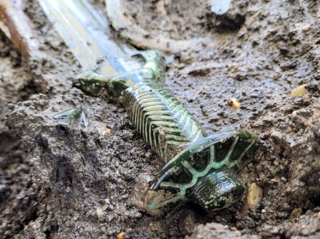 Le 14 juin 2023, à Nördlingen (Allemagne) : une épée de l’âge du bronze a été découverte lors de fouilles dans le Donau-Ries (en Bavière). L’épée découverte par les archéologues est particulièrement bien conservée – elle brille telle Excalibur ! -.