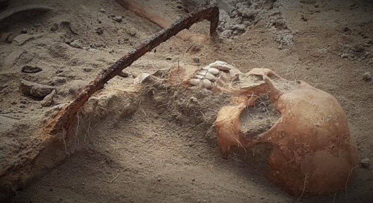 L’épée a été trouvée dans un contexte funéraire, une sépulture. L’arme reposait le long du corps d’un défunt. Pas moins de trois personnes ont été enterrées successivement dans cette même tombe, parmi lesquels un homme, une femme et un adolescent de sexe inconnu. Pour le moment, les archéologues ignorent si les individus avaient un lien de parenté. Des pointes de flèches ont également été retrouvées.